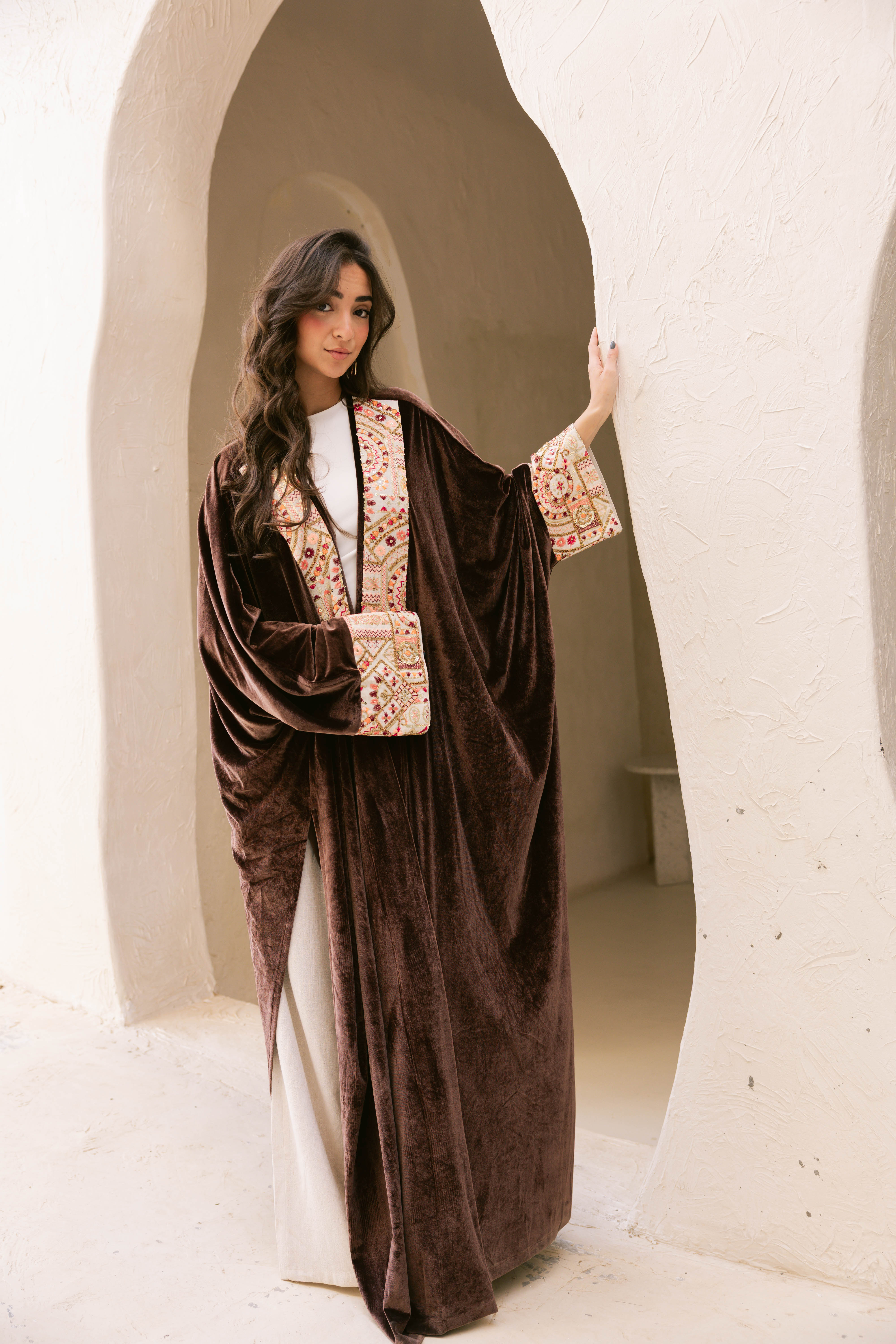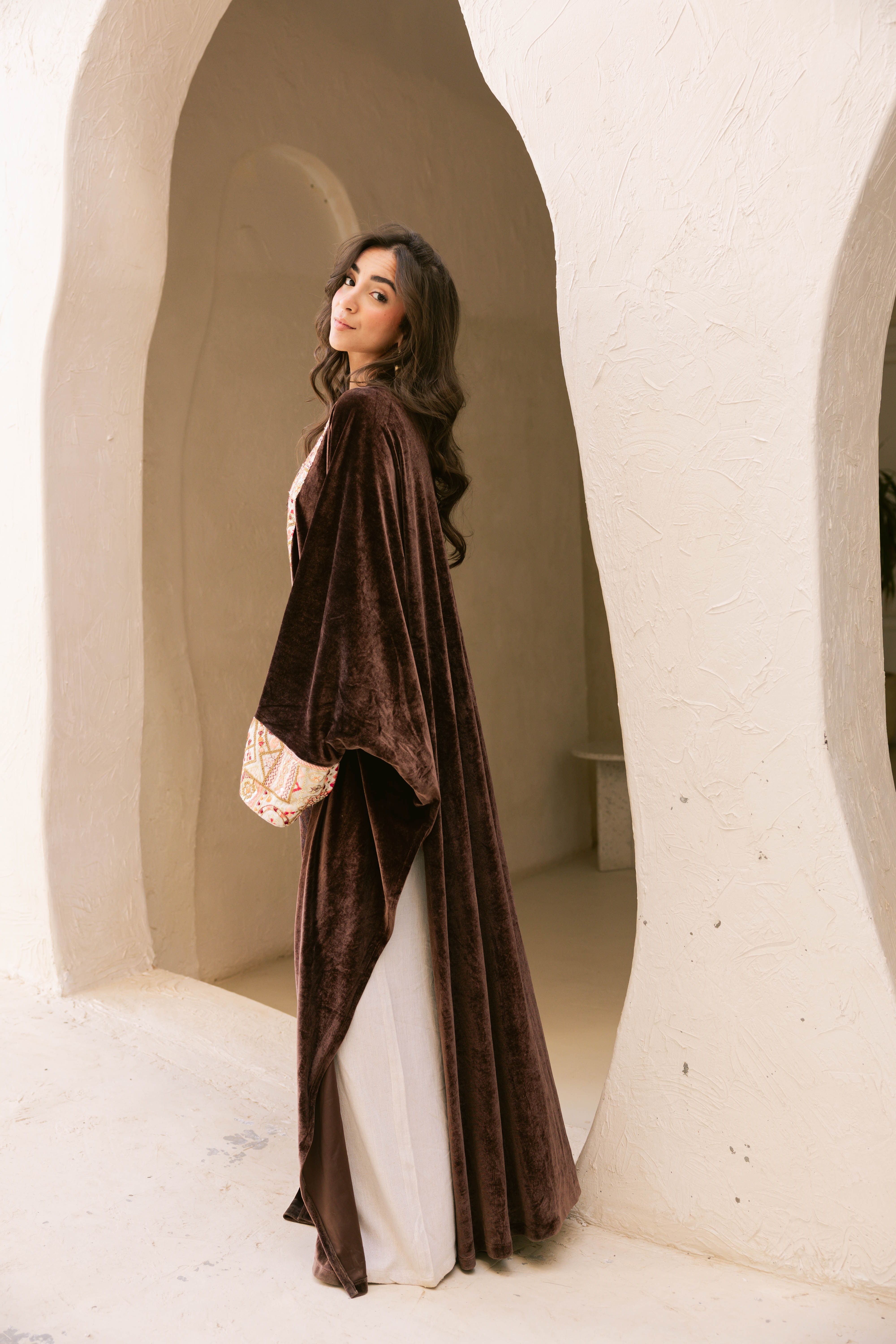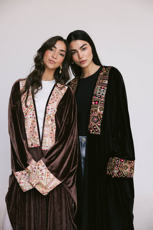 Crafted from luxurious velvet and accented with unique Indian fabric inserts, the Badia Kaftan blends earthy elegance with artistic craftsmanship. The contrast between the soft velvet base and the textured fabric details creates a striking statement that feels both traditional and modern.