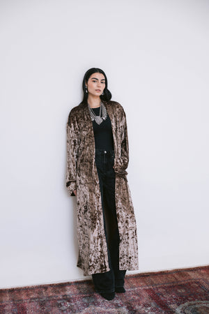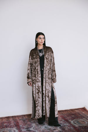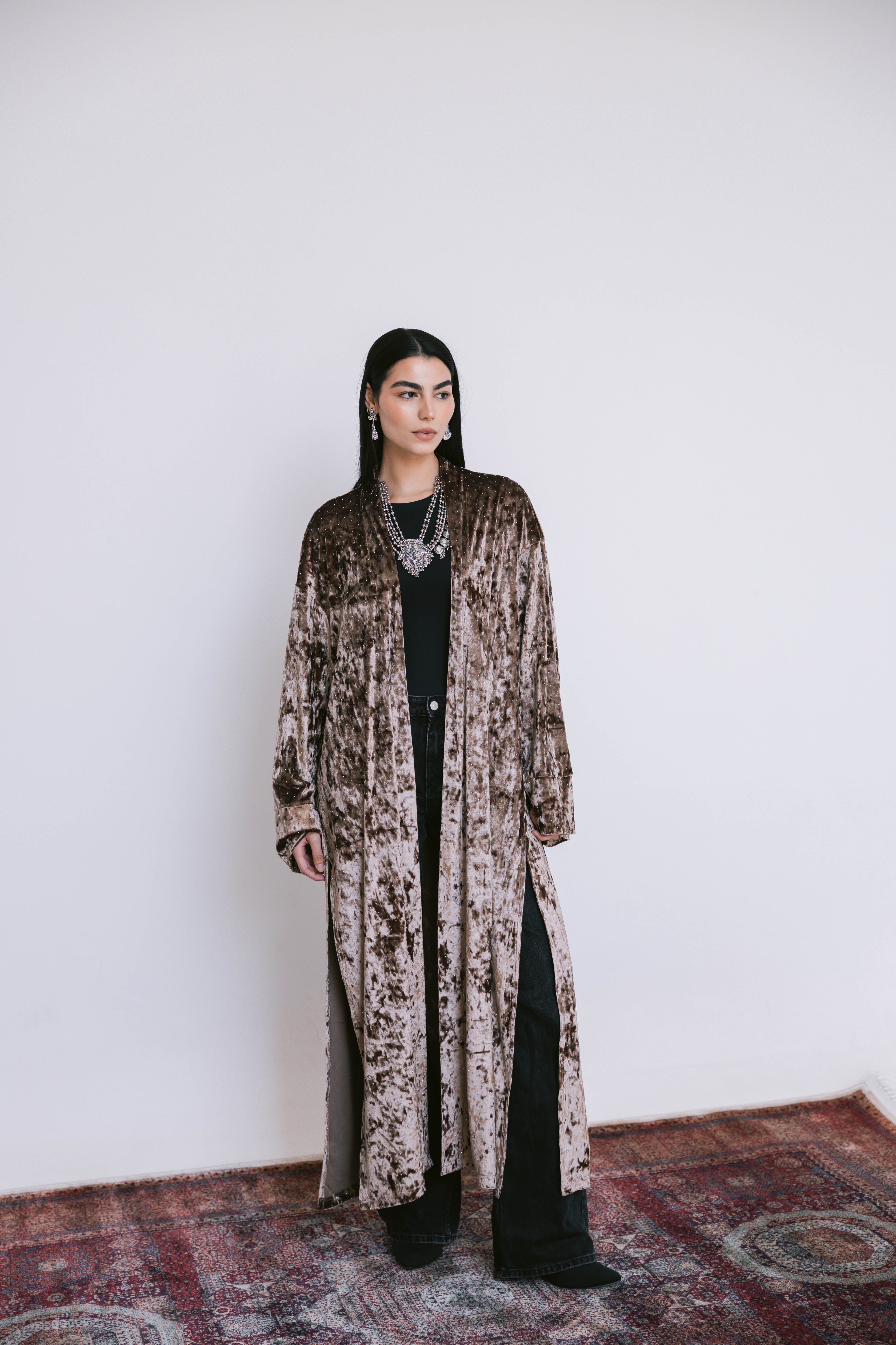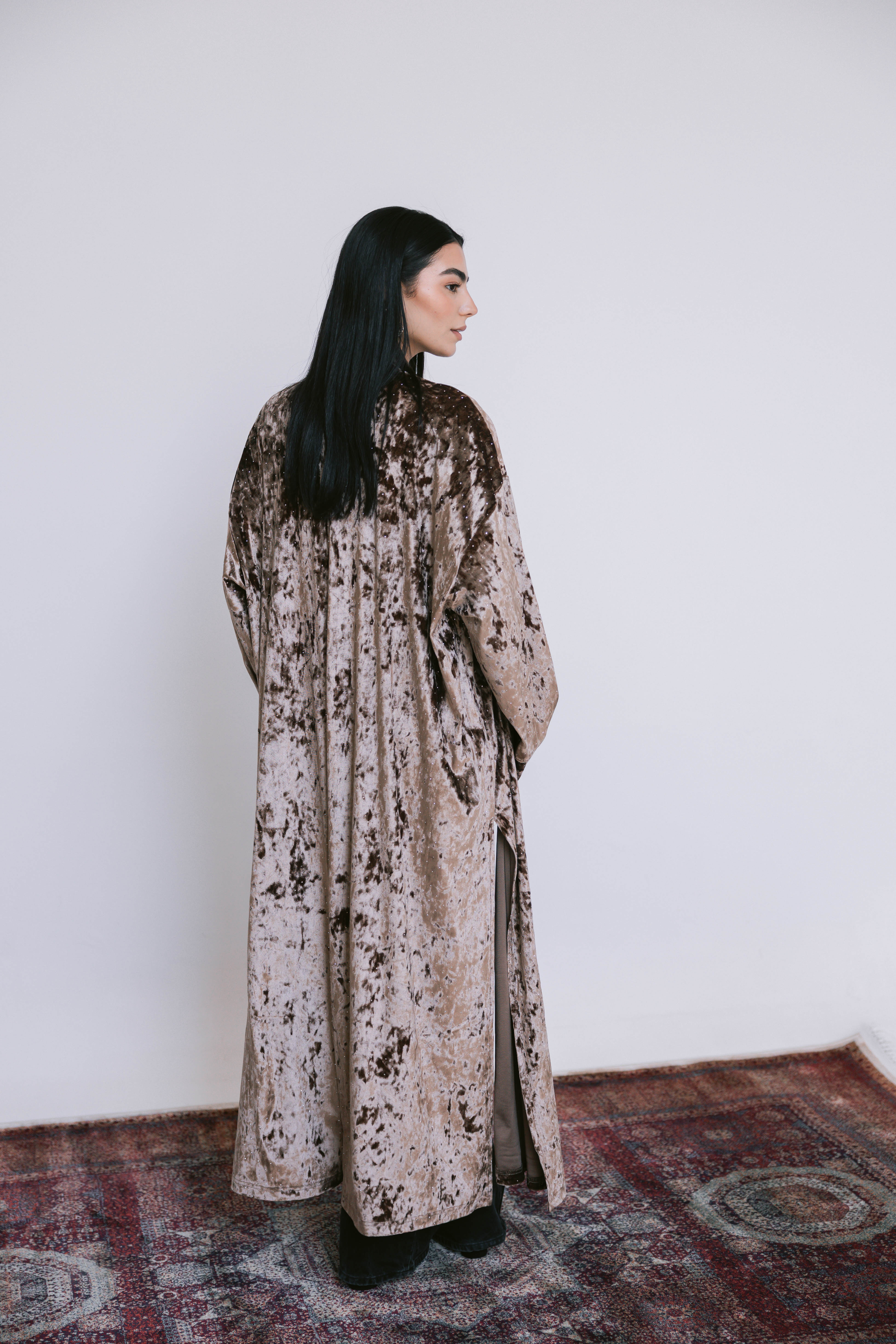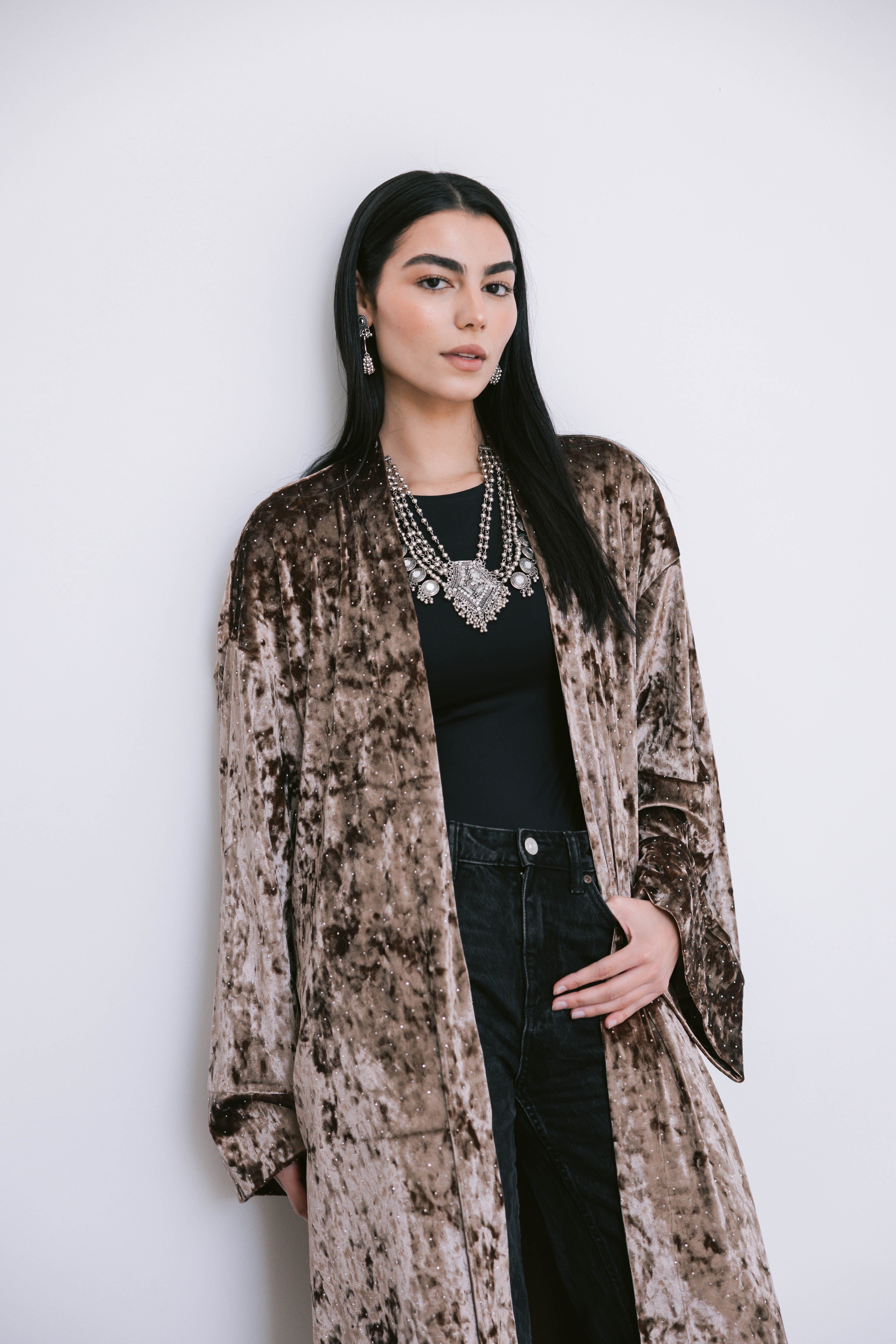Crafted from soft, lustrous velvet and finished with subtle strass detailing, the Layali Kaftan brings a gentle sparkle to a fluid, elongated silhouette. The light-catching accents add a refined glow, making this piece perfect for night gatherings and festive moments.