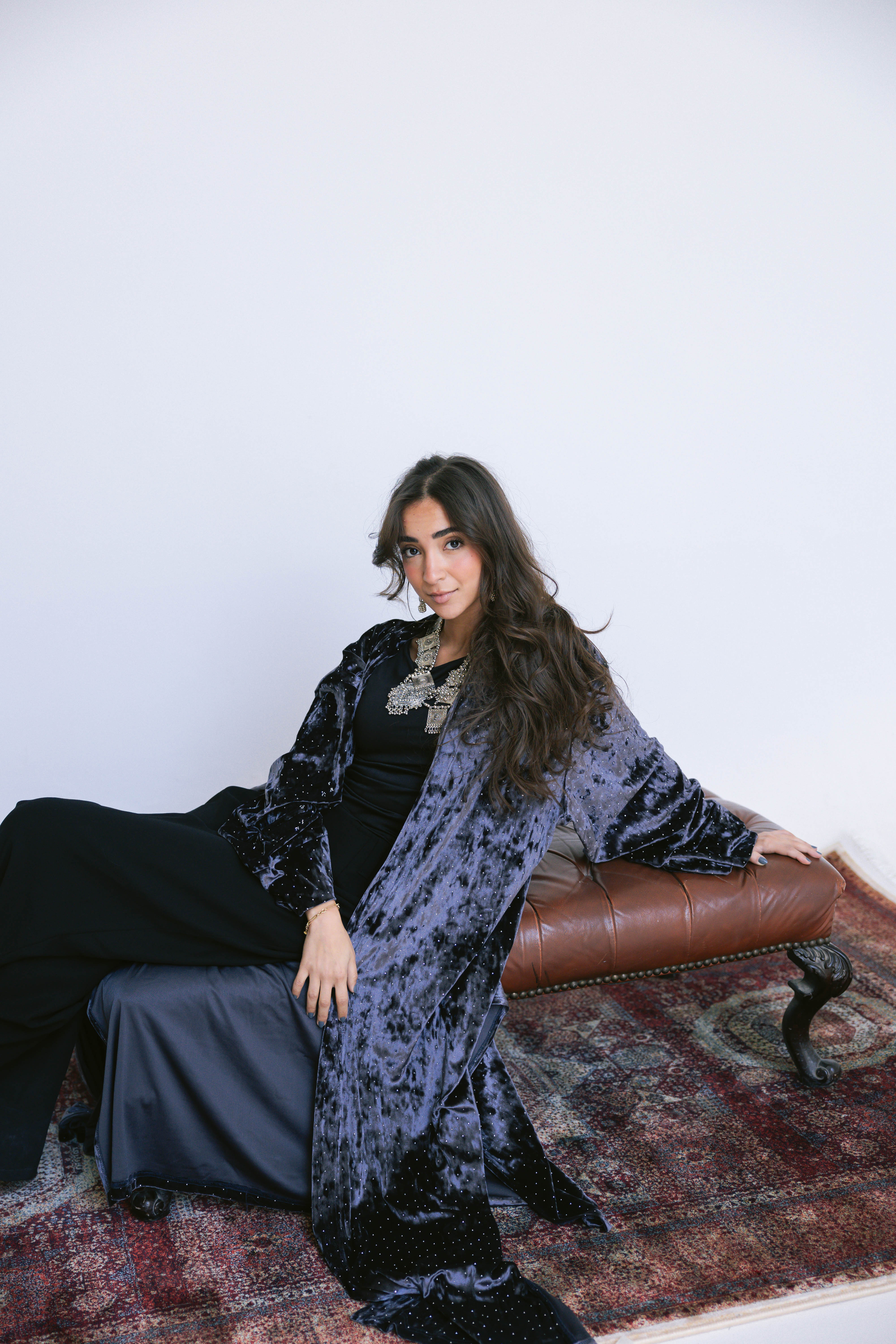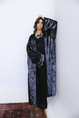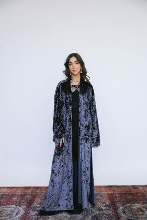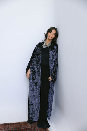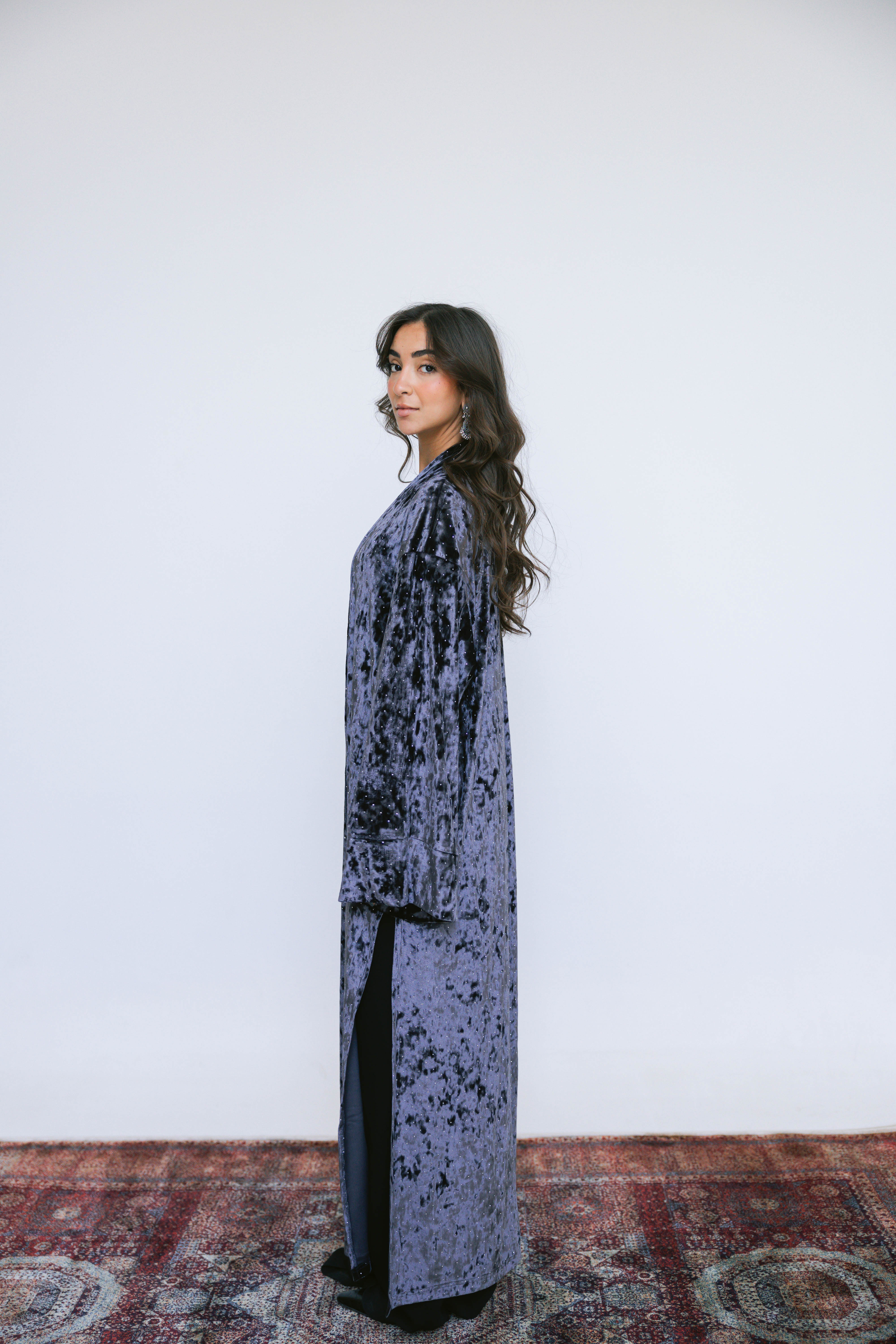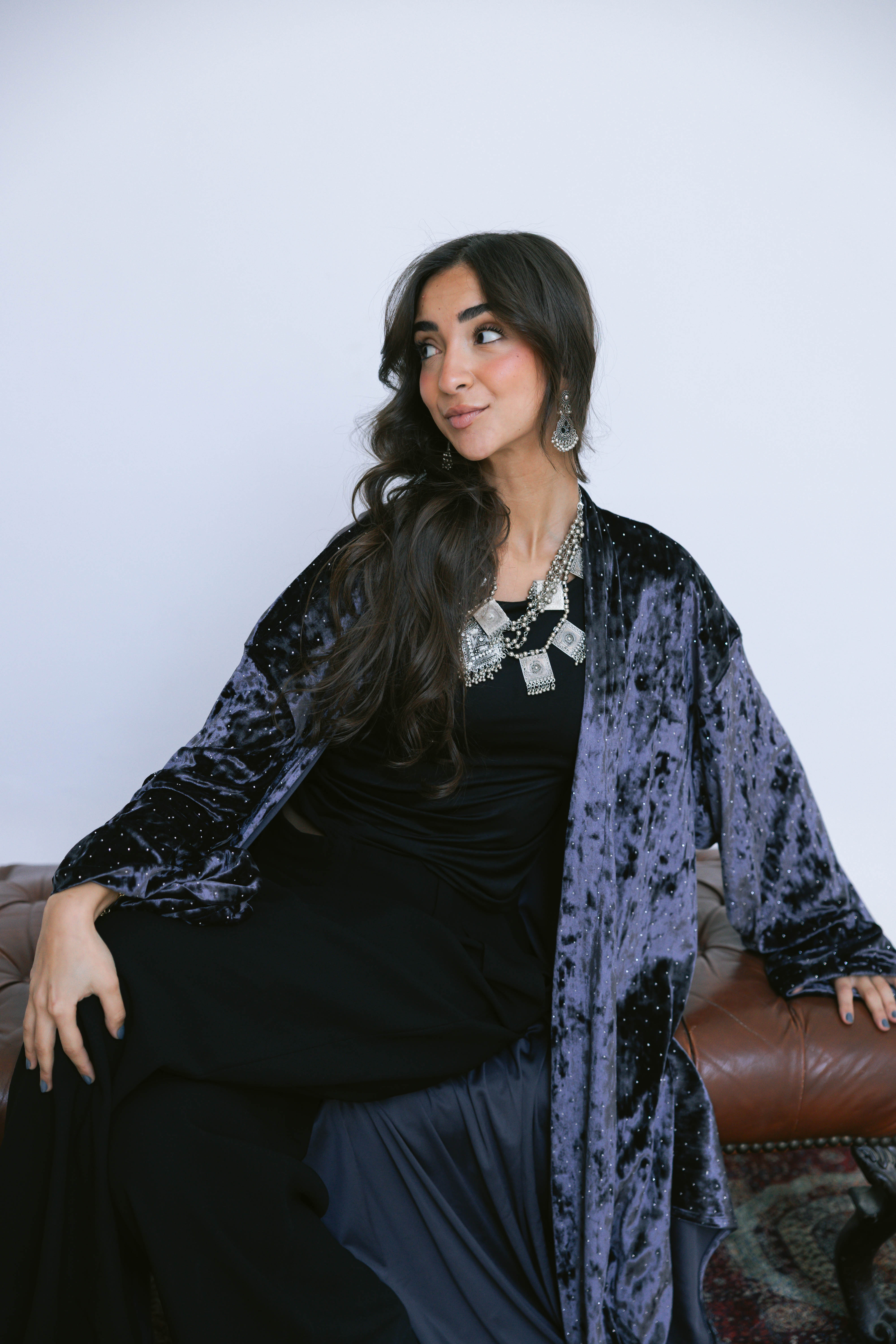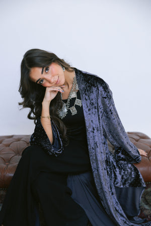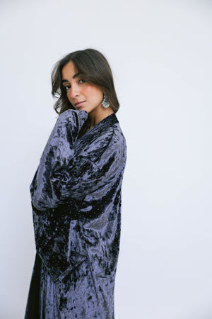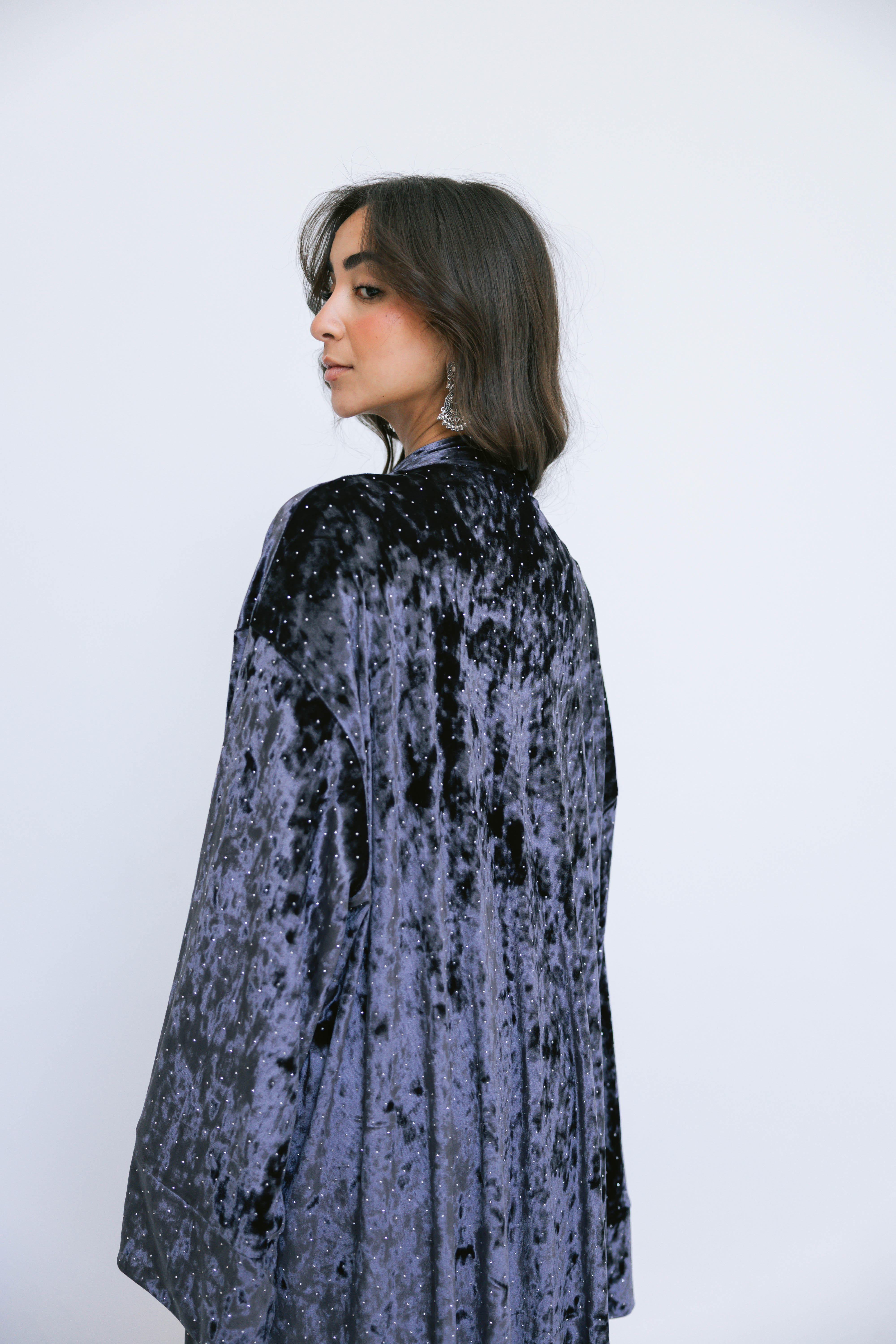 Crafted from soft, lustrous velvet and finished with subtle strass detailing, the Layali Kaftan brings a gentle sparkle to a fluid, elongated silhouette. The light-catching accents add a refined glow, making this piece perfect for night gatherings and festive moments.