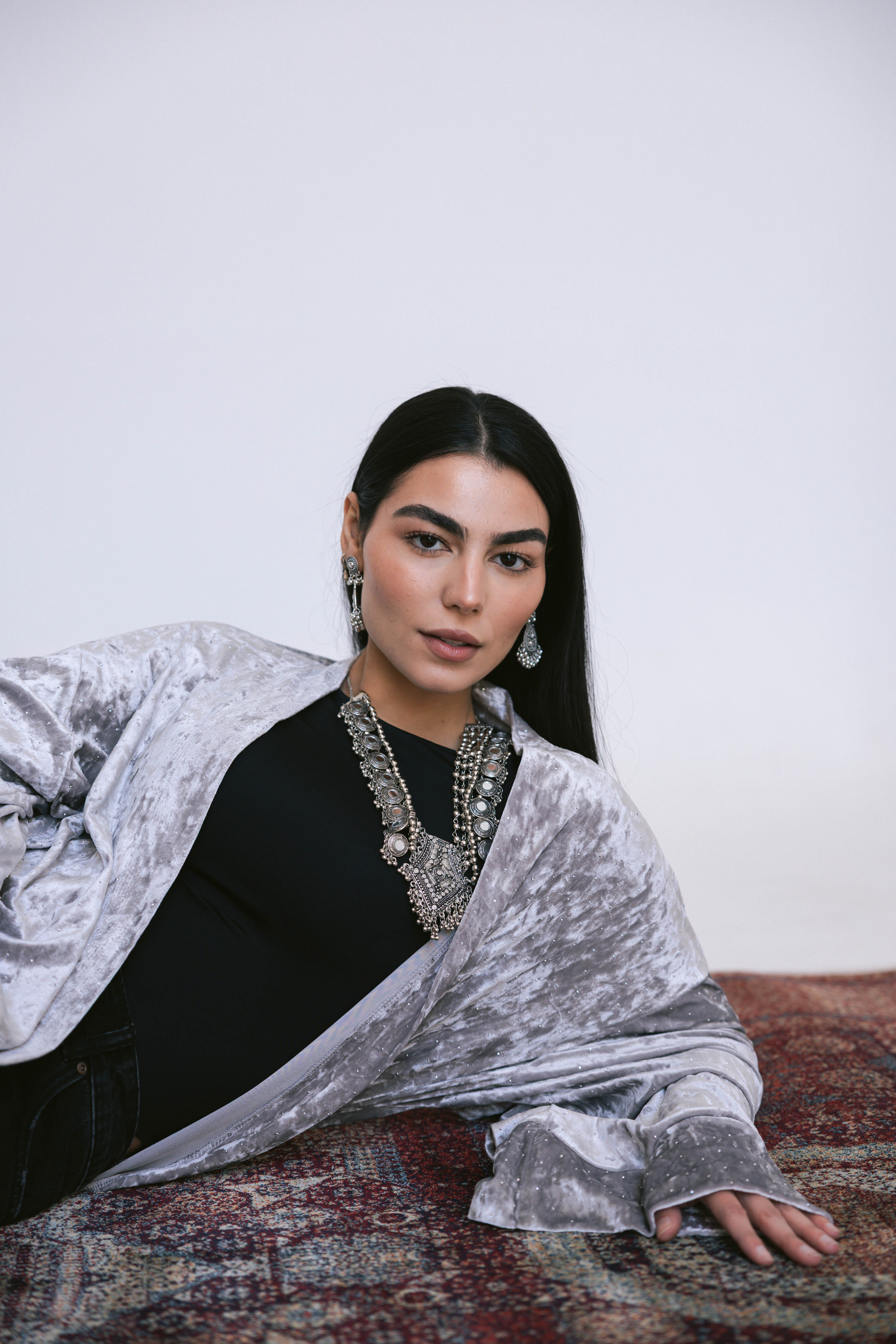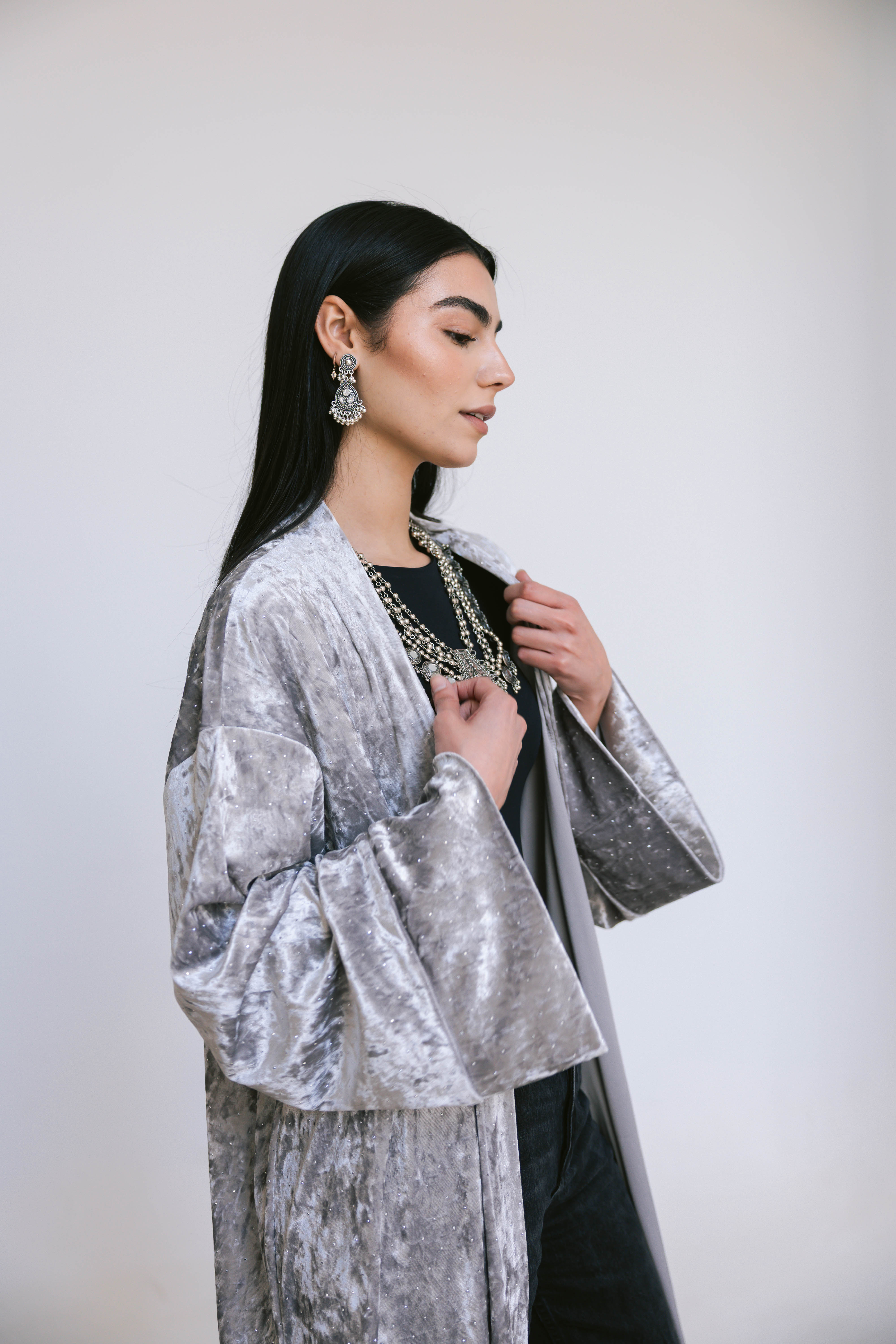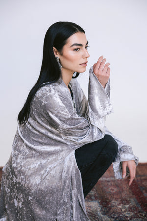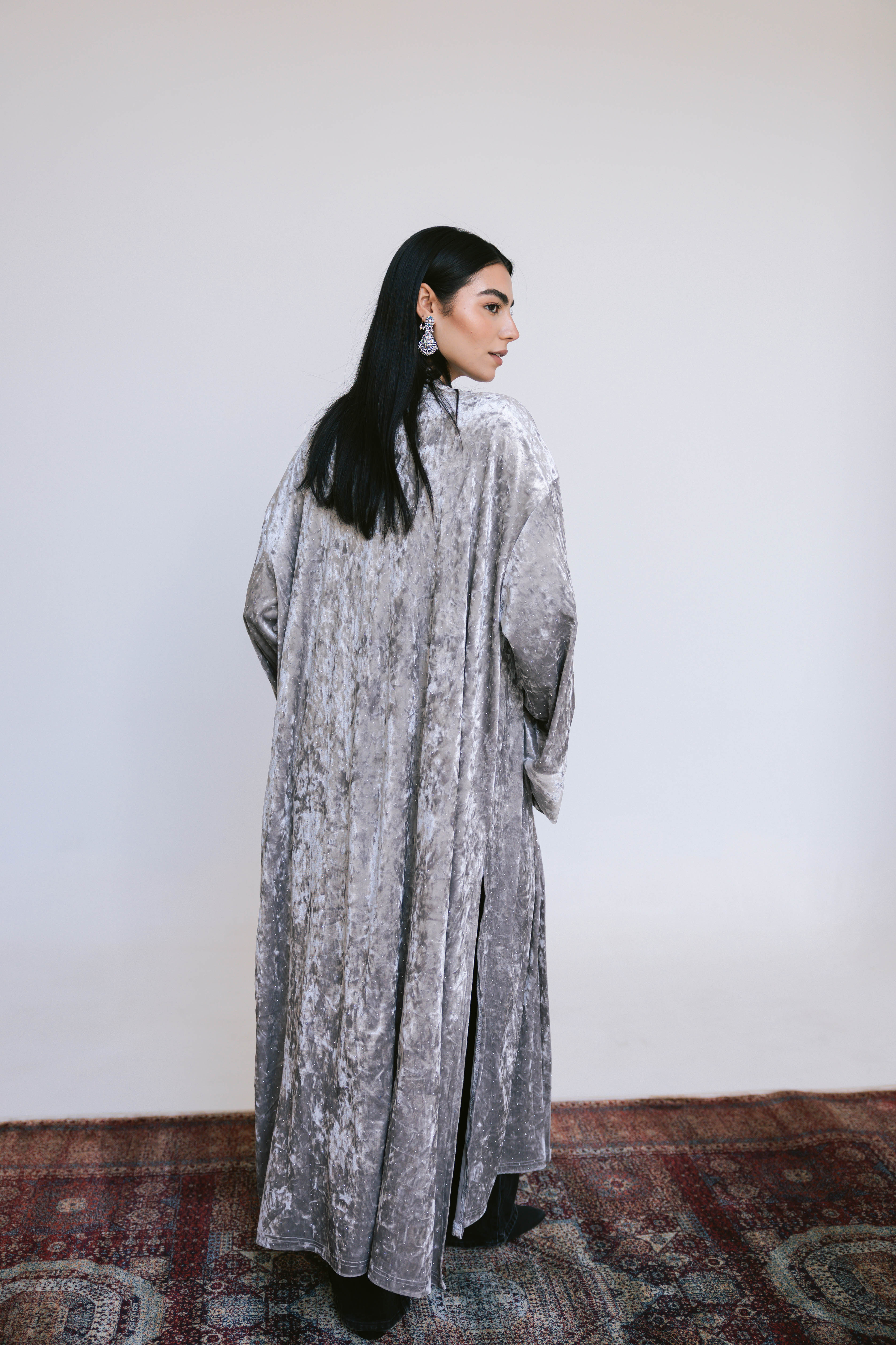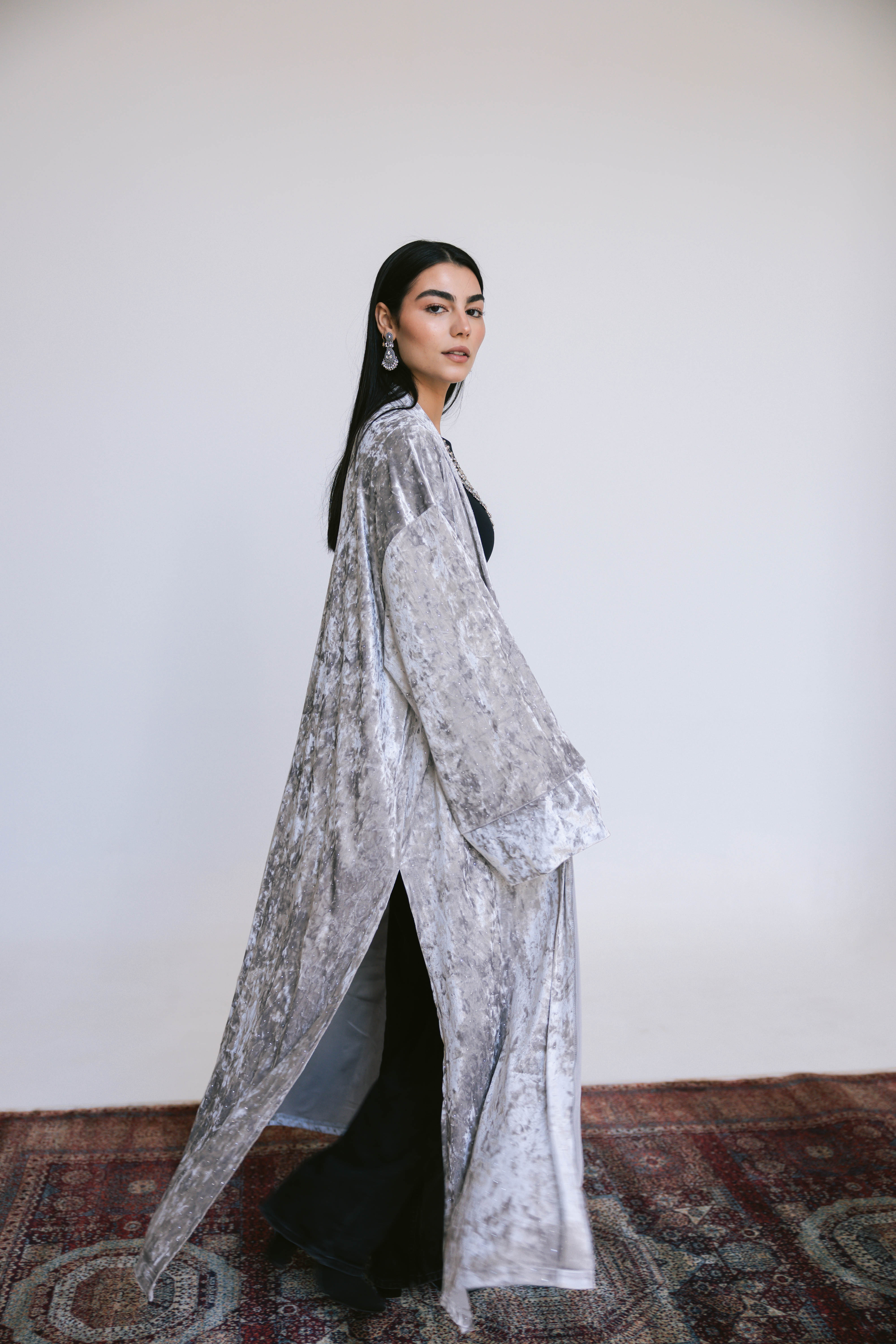 Crafted from soft, lustrous velvet and finished with subtle strass detailing, the Layali Kaftan brings a gentle sparkle to a fluid, elongated silhouette. The light-catching accents add a refined glow, making this piece perfect for night gatherings and festive moments.
