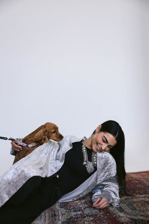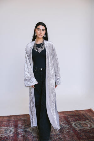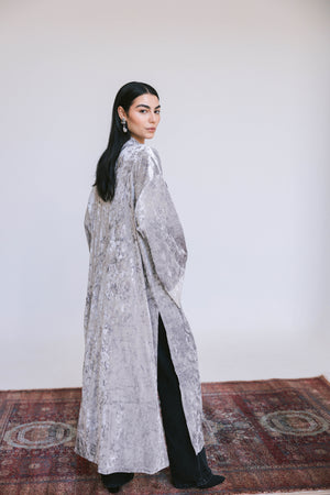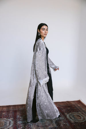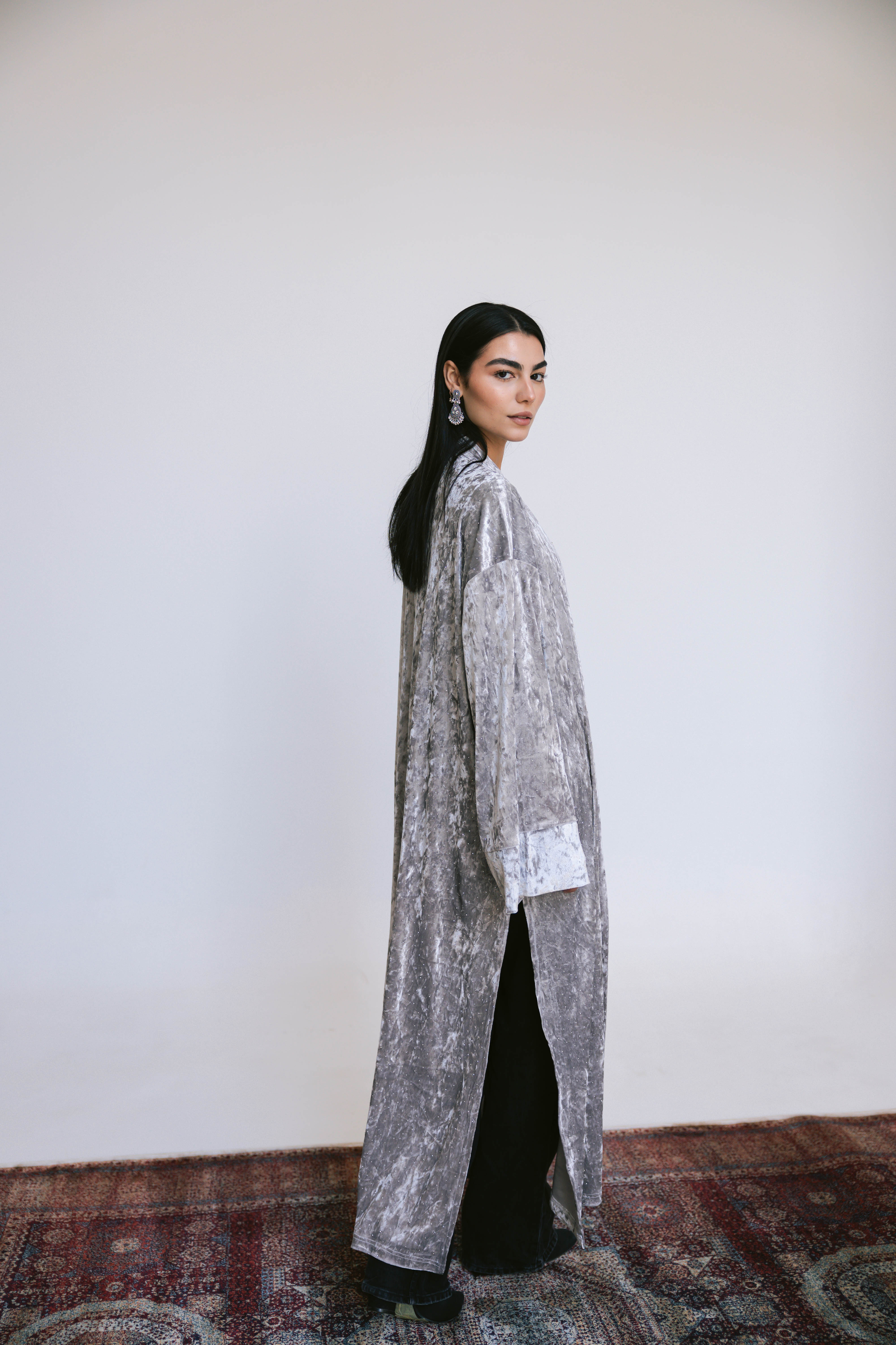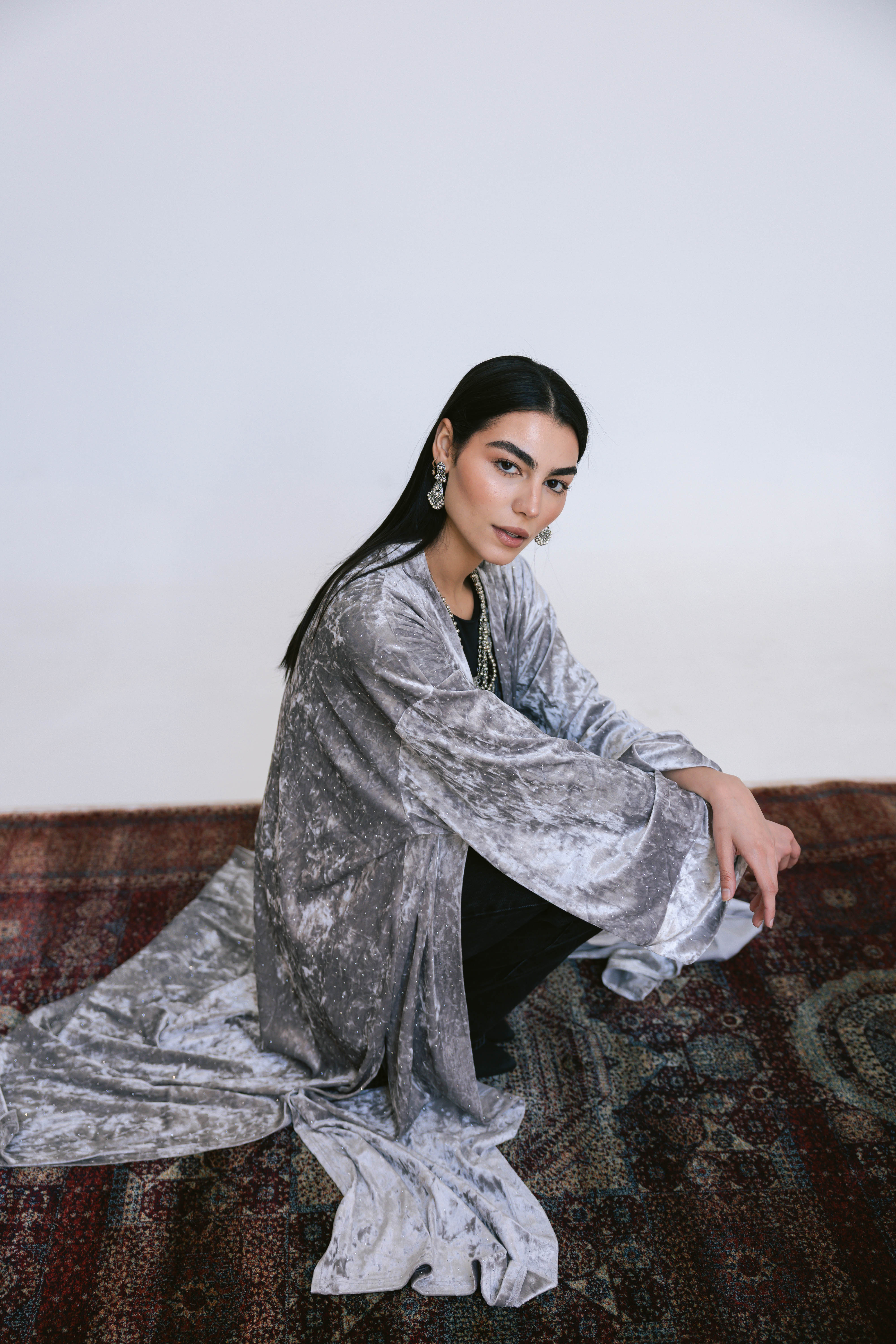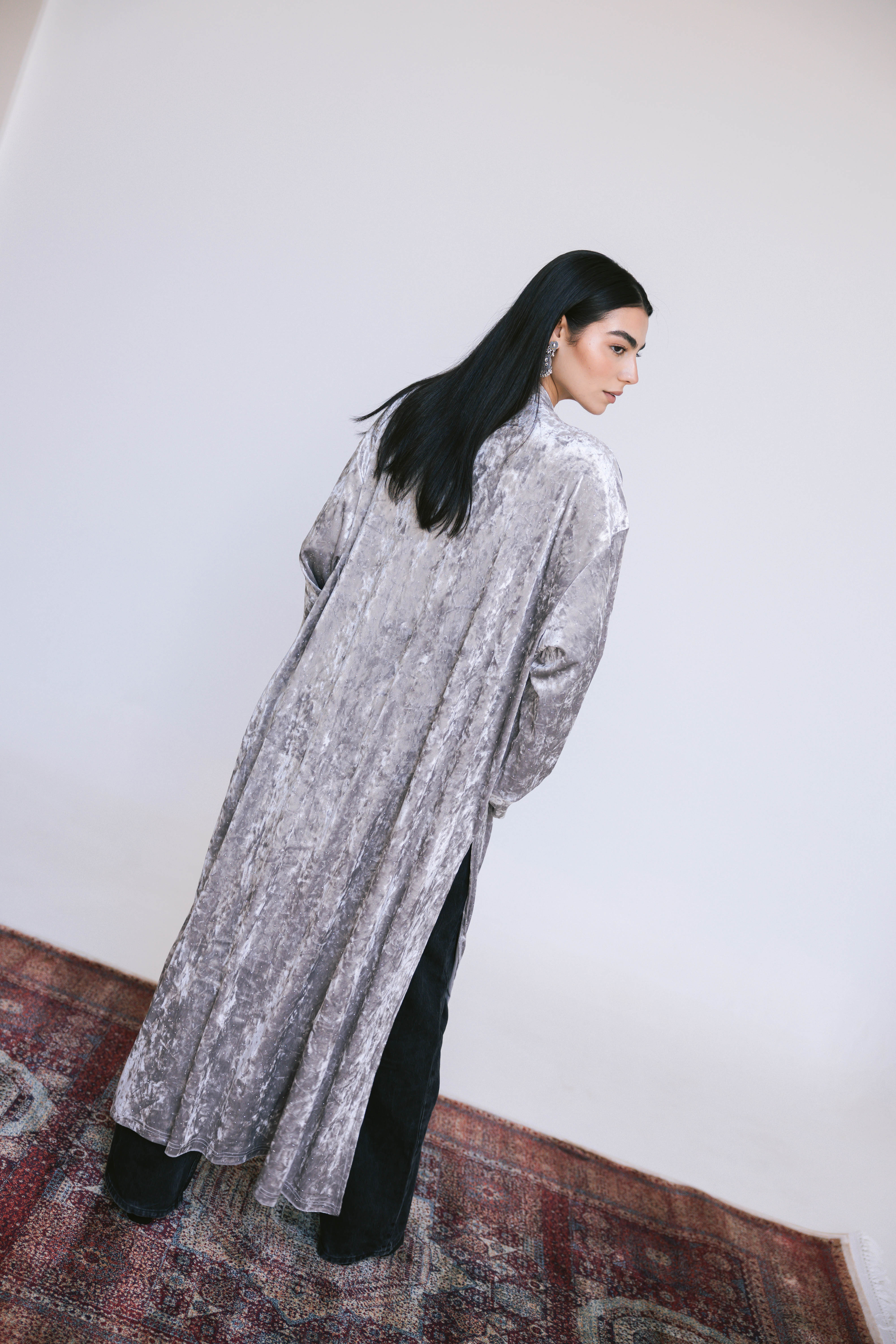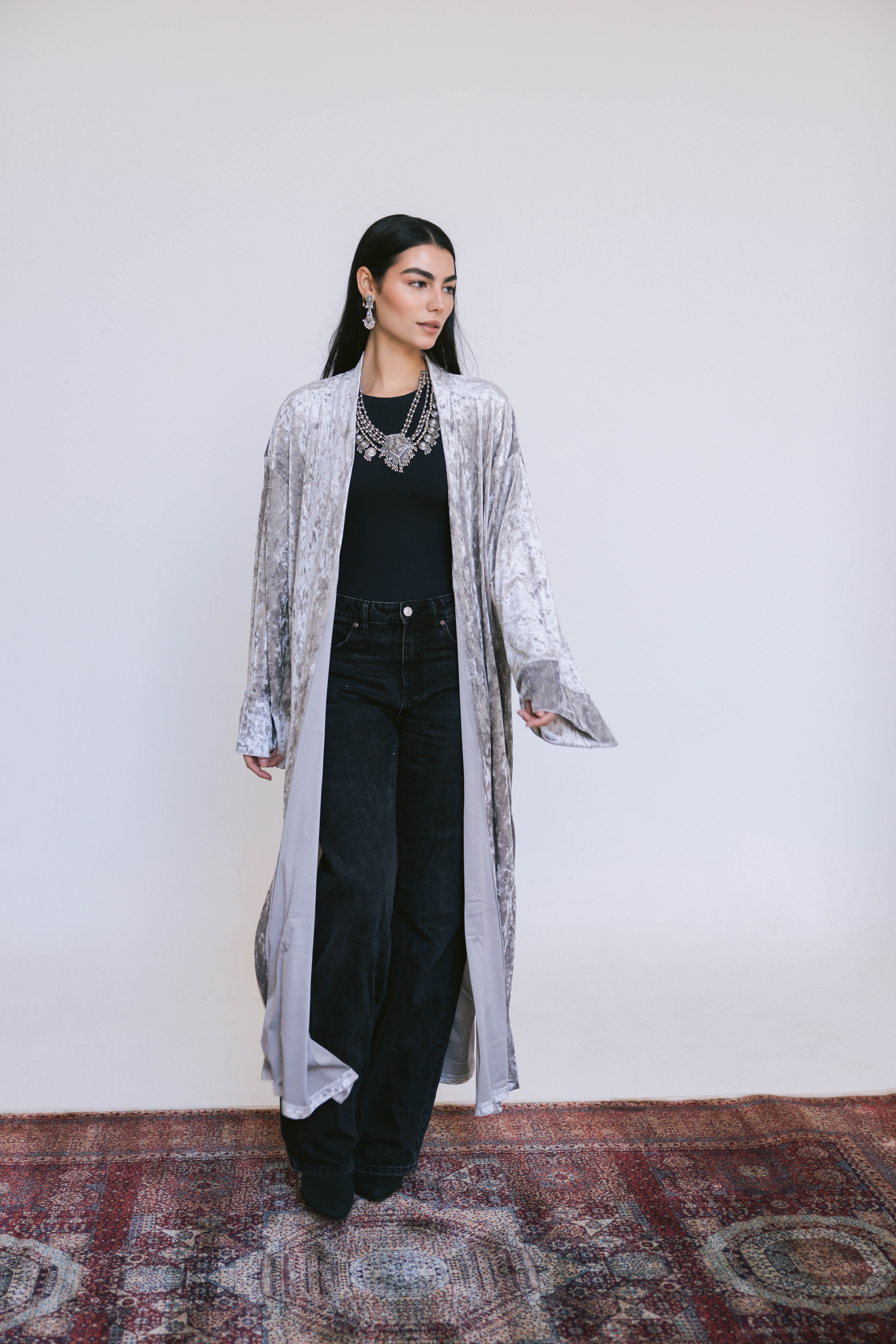 Crafted from soft, lustrous velvet and finished with subtle strass detailing, the Layali Kaftan brings a gentle sparkle to a fluid, elongated silhouette. The light-catching accents add a refined glow, making this piece perfect for night gatherings and festive moments.