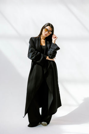 - Open front with flowy drape cut