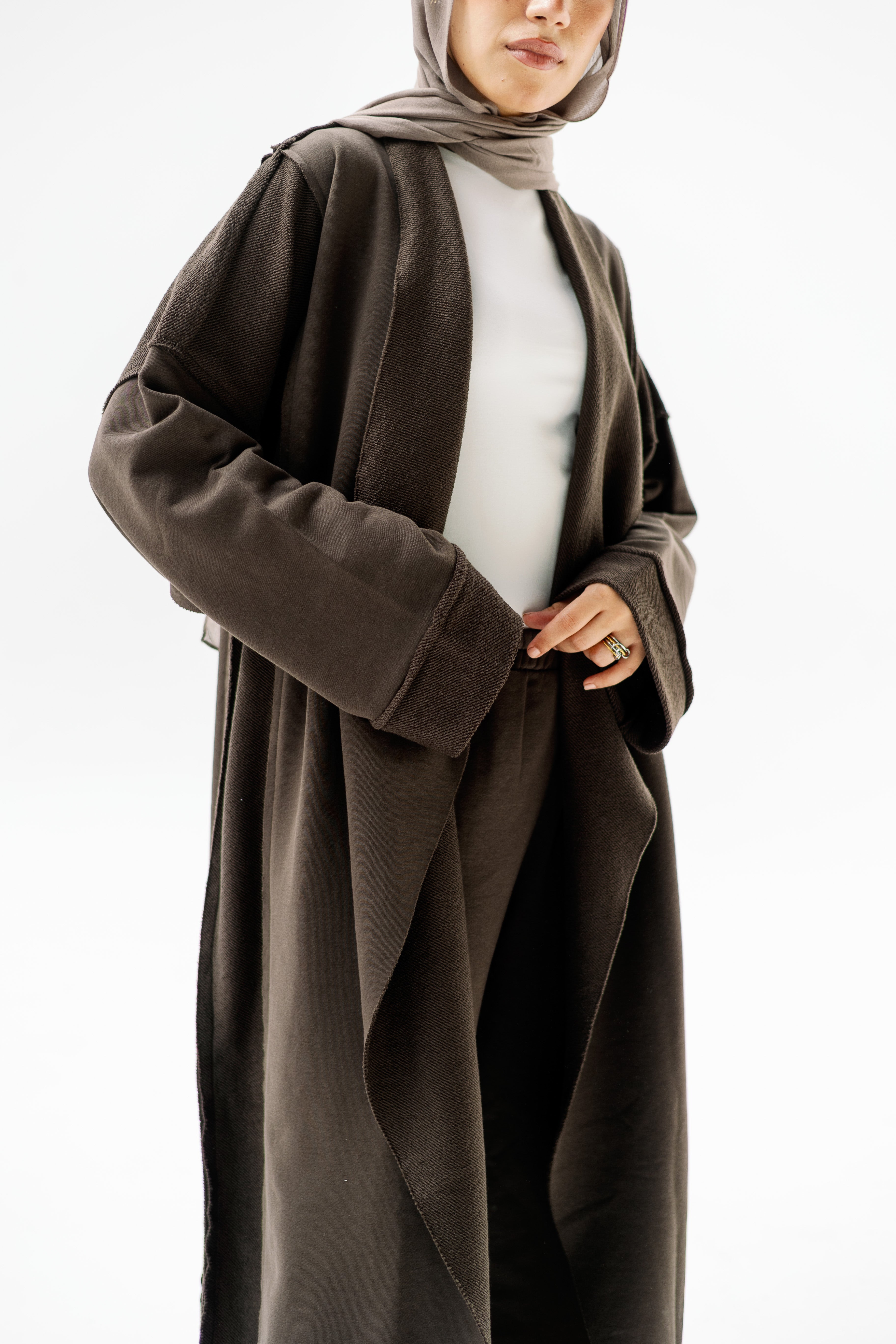 - Open front with flowy drape cut