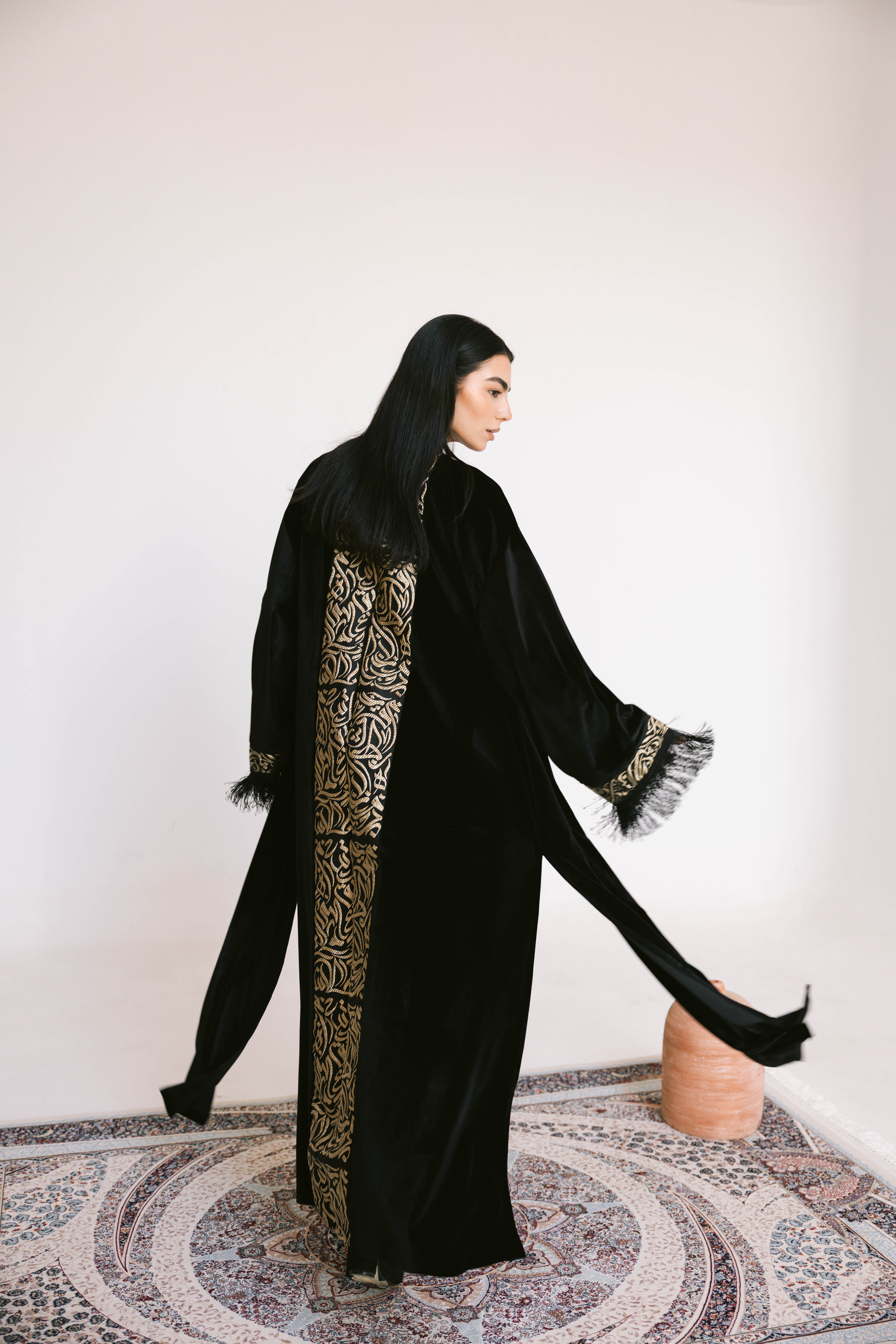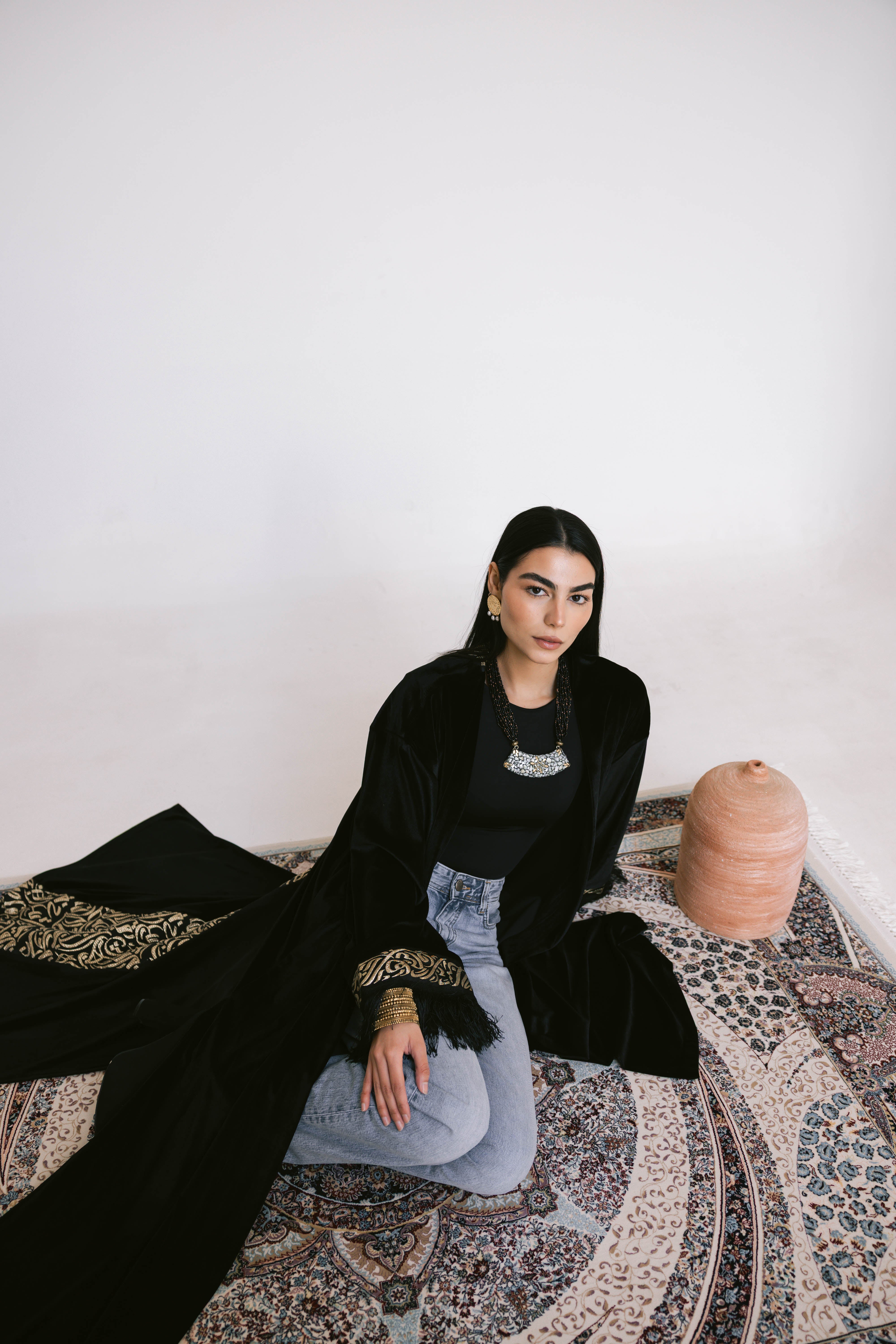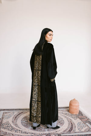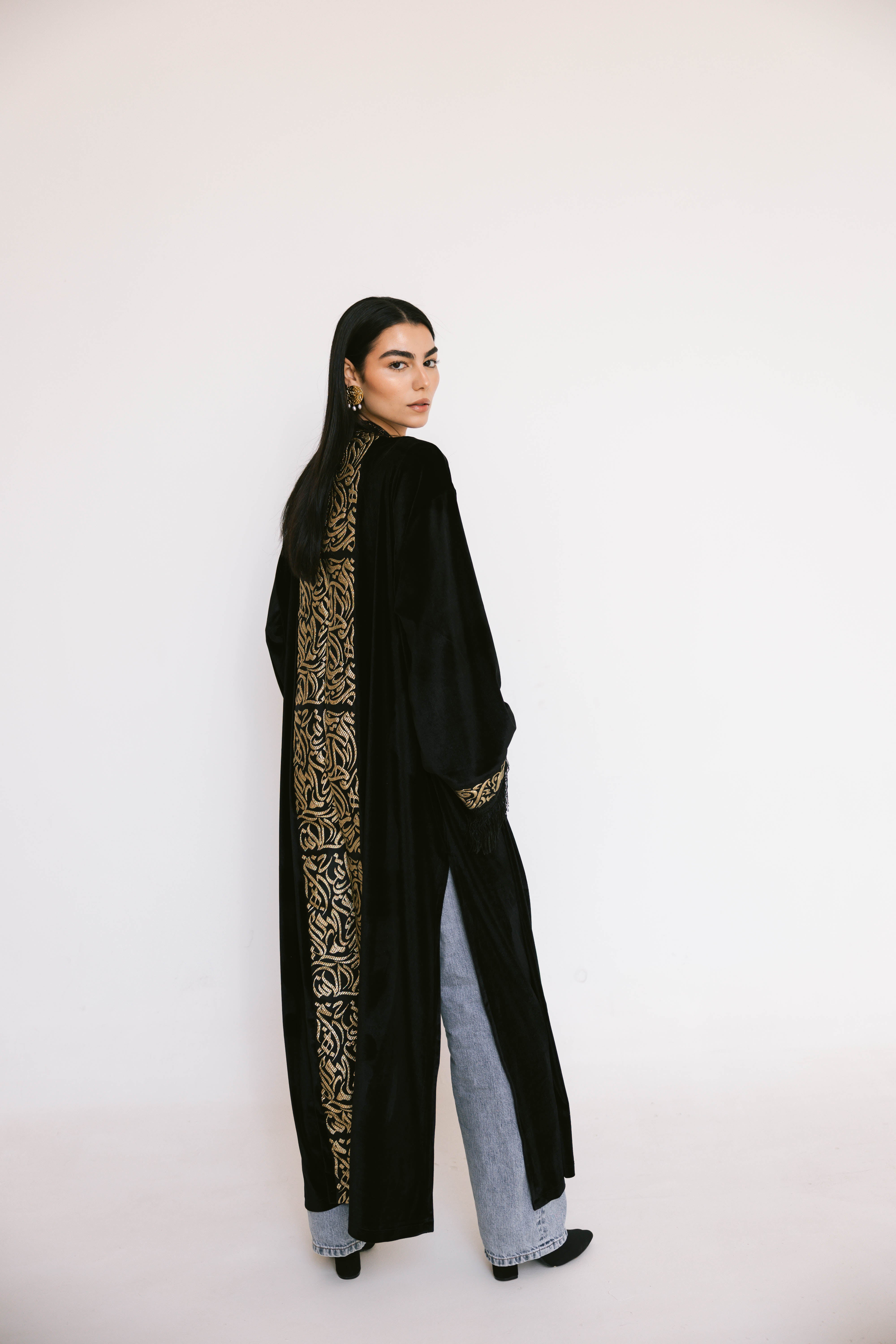 Crafted from soft, luxurious velvet, the Nyla Kaftan is elevated with delicate Arabic calligraphy details that add depth and character to its flowing silhouette. The rich texture of the velvet gives a subtle glow, making this piece perfect for elevated evening looks.