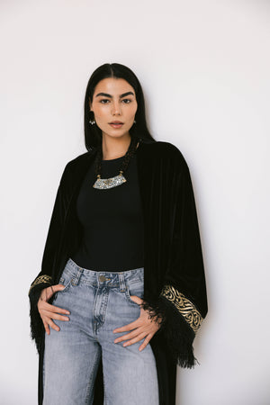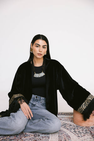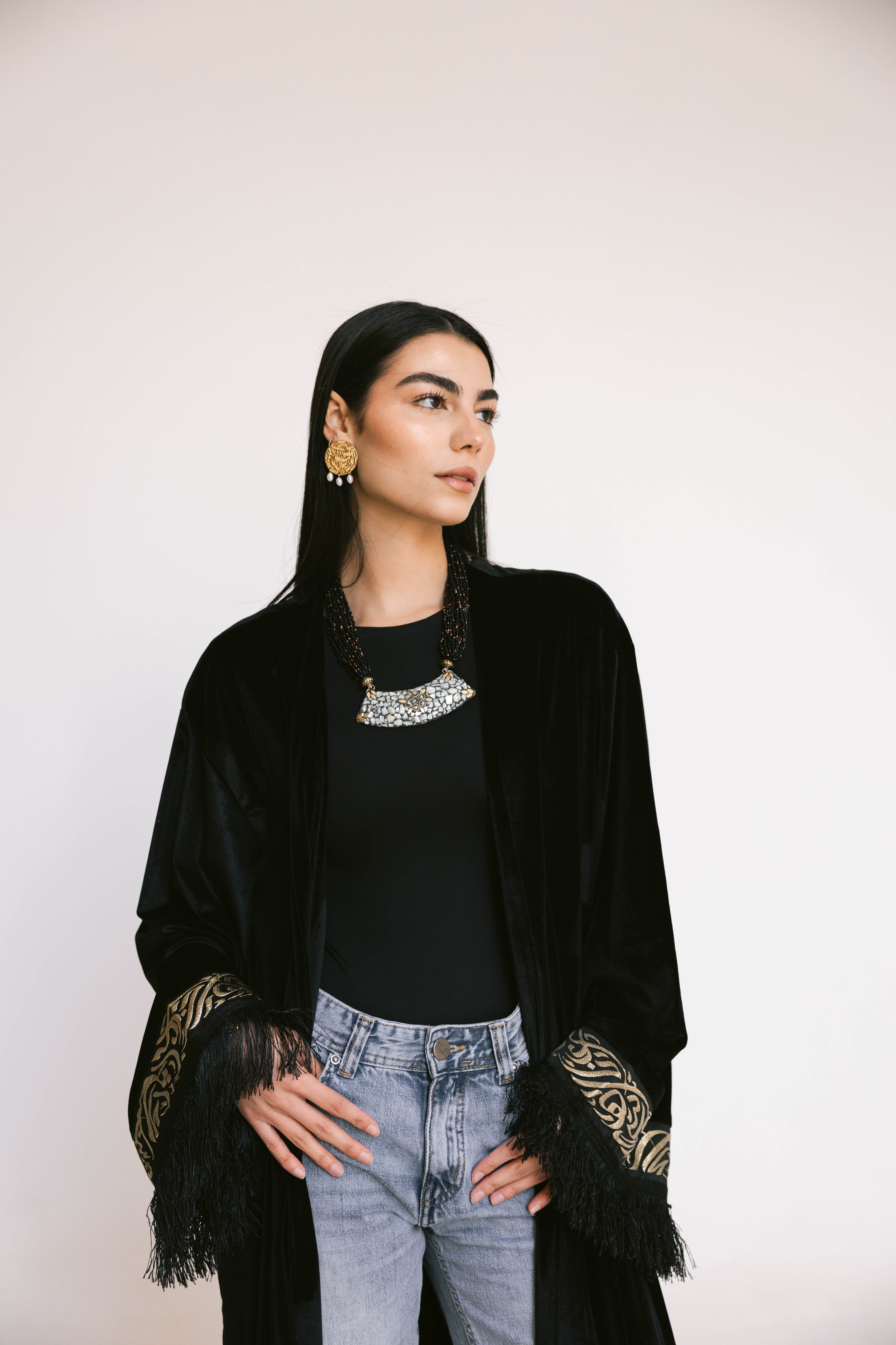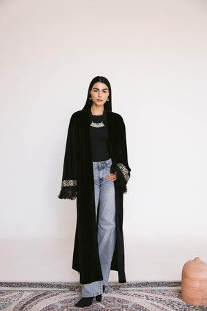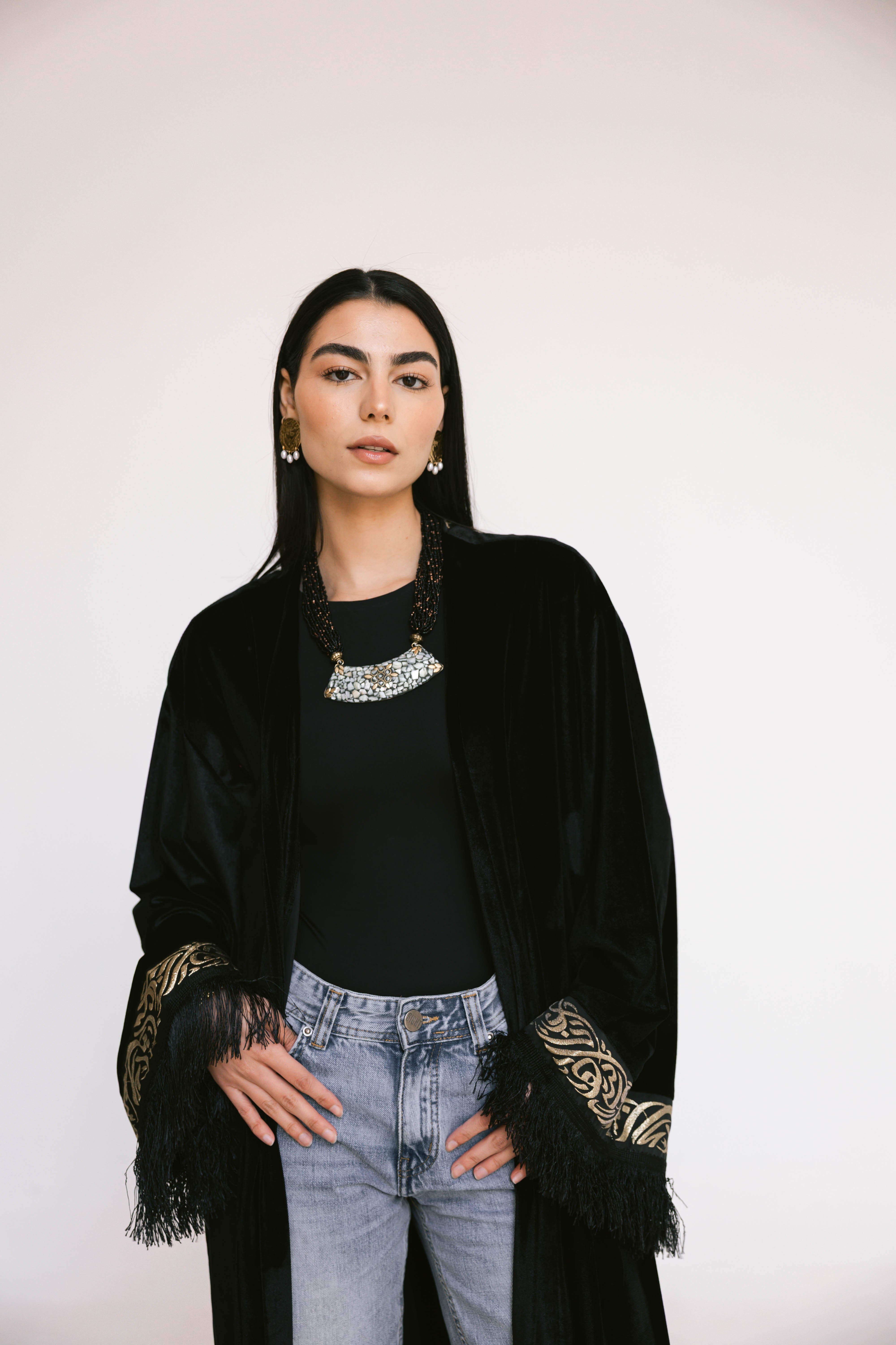 Crafted from soft, luxurious velvet, the Nyla Kaftan is elevated with delicate Arabic calligraphy details that add depth and character to its flowing silhouette. The rich texture of the velvet gives a subtle glow, making this piece perfect for elevated evening looks.