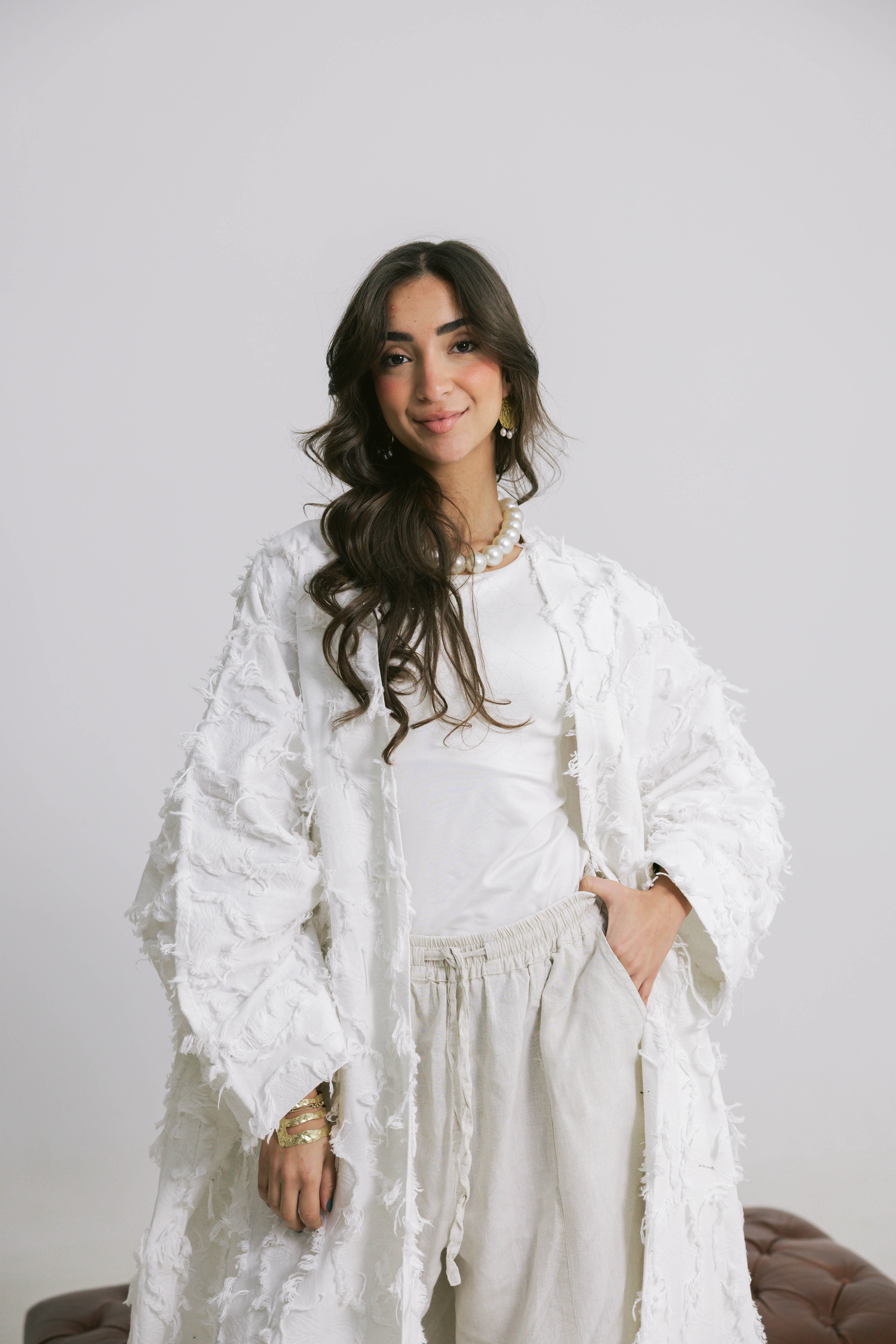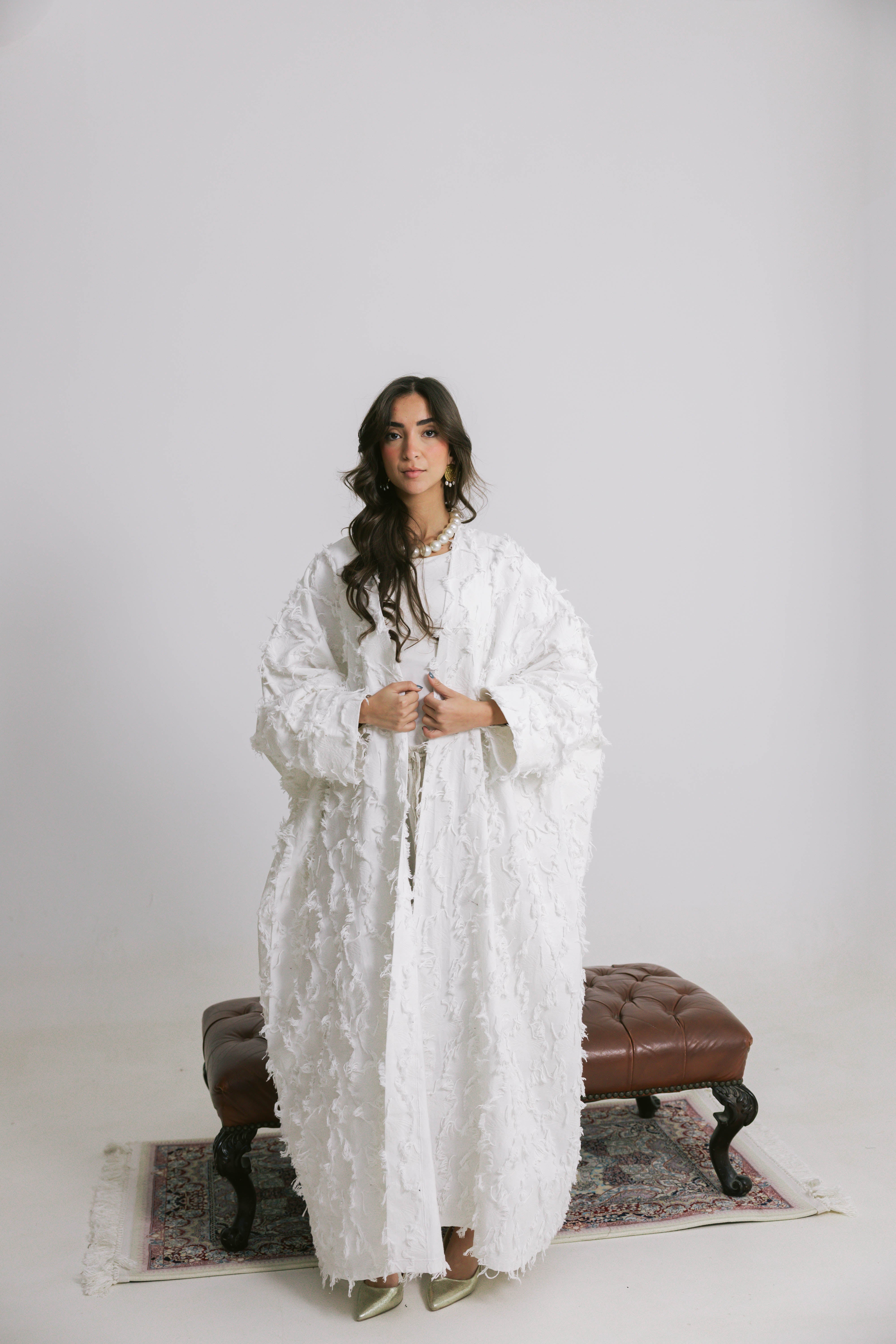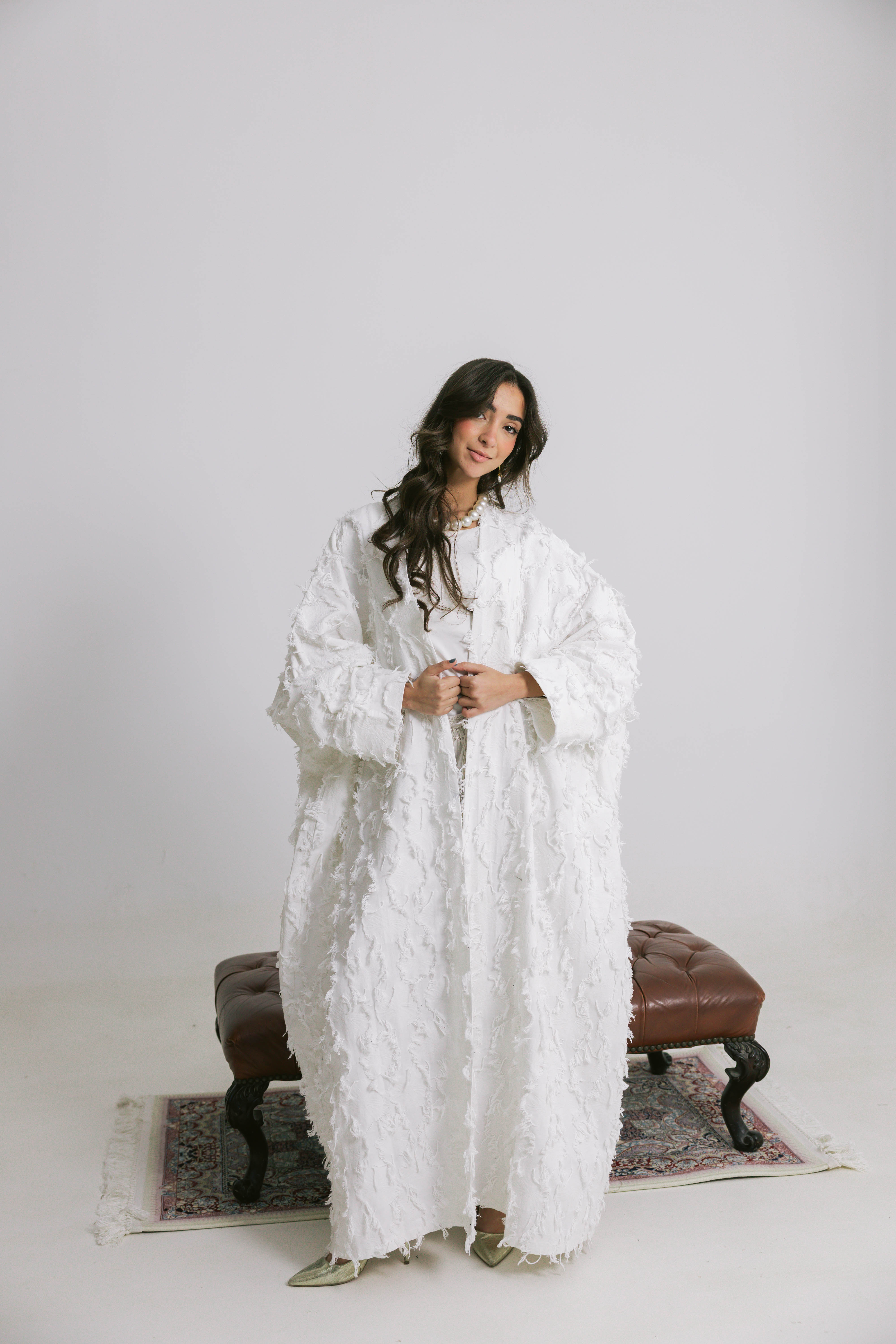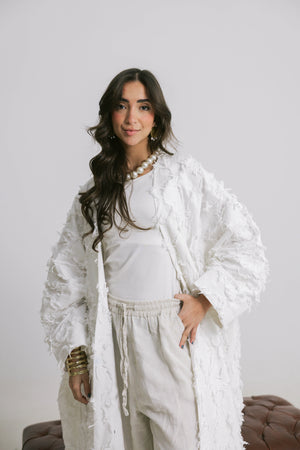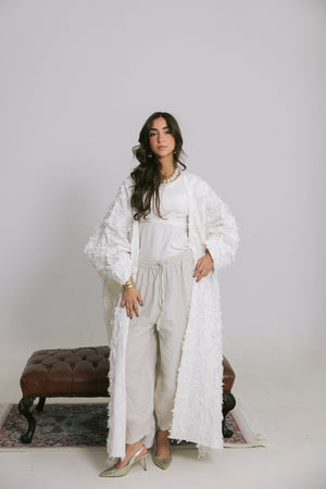 Crafted from premium breathable linen, the Rimal Kaftan brings a soft, organic feel to a flowing silhouette. The textured fabric adds subtle depth and movement, giving the piece a relaxed yet refined presence that feels light on the skin.