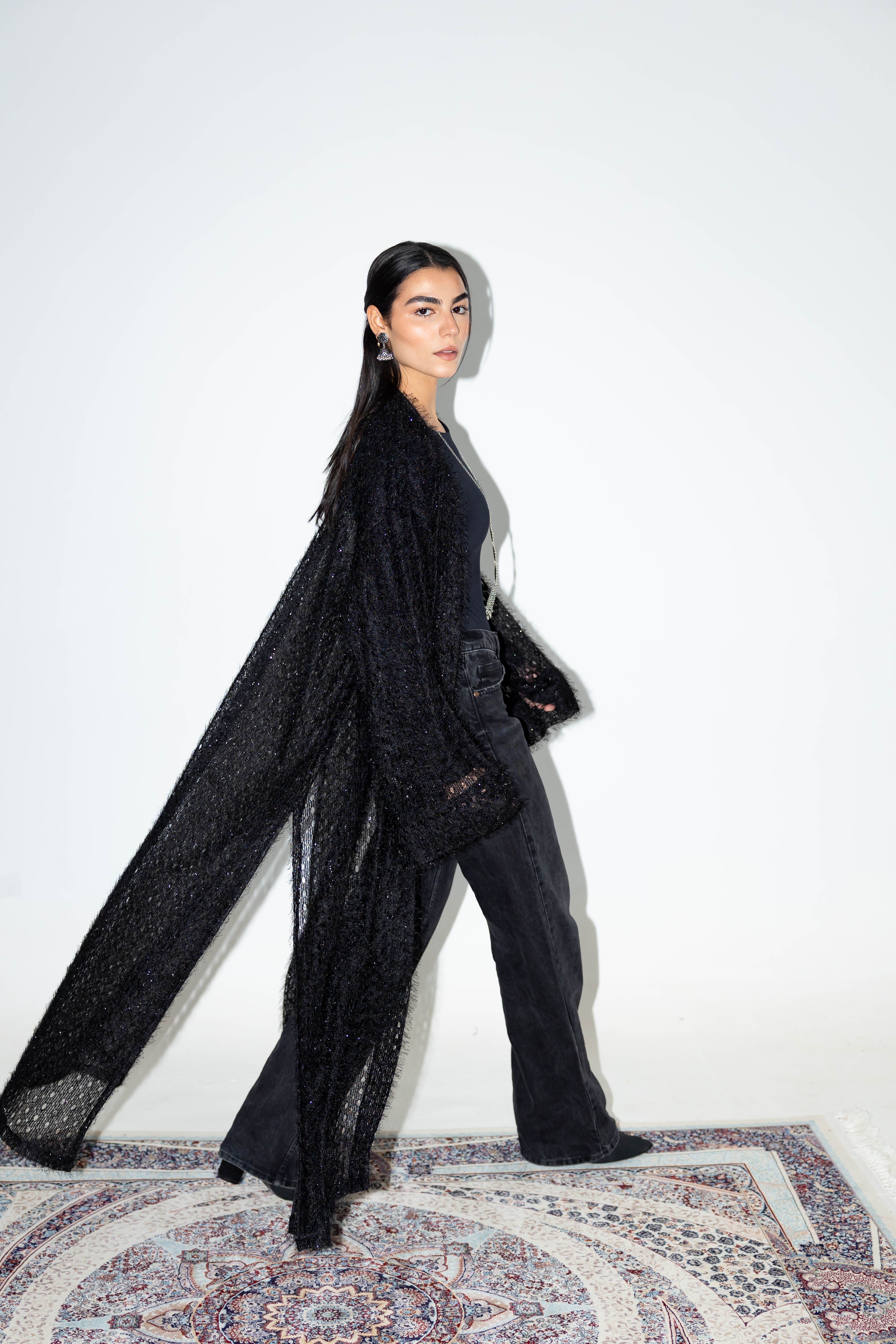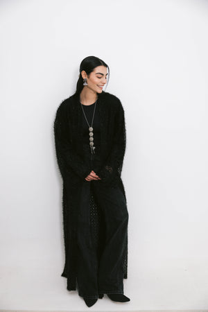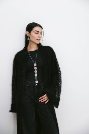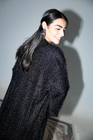 The Sahar Cardigan features a delicate, airy texture with subtle shimmer that catches the light effortlessly. Its lightweight feel and fluid drape create an easy, relaxed silhouette that adds warmth without heaviness, making it perfect for layering over both casual and elevated looks.
