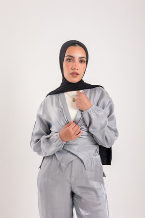This stunning two piece suit crafted from a glossy lightweight fabric features a wrap-style blouse with gathered sleeves and high-waisted trousers for a sleek yet effortless look The set was a bestseller last season and due to its high demand making a comeback this year Perfect for both casual chic and elegant occasions, this suit blends sophistication with comfort making it a must-have for your wardrobe once again.
